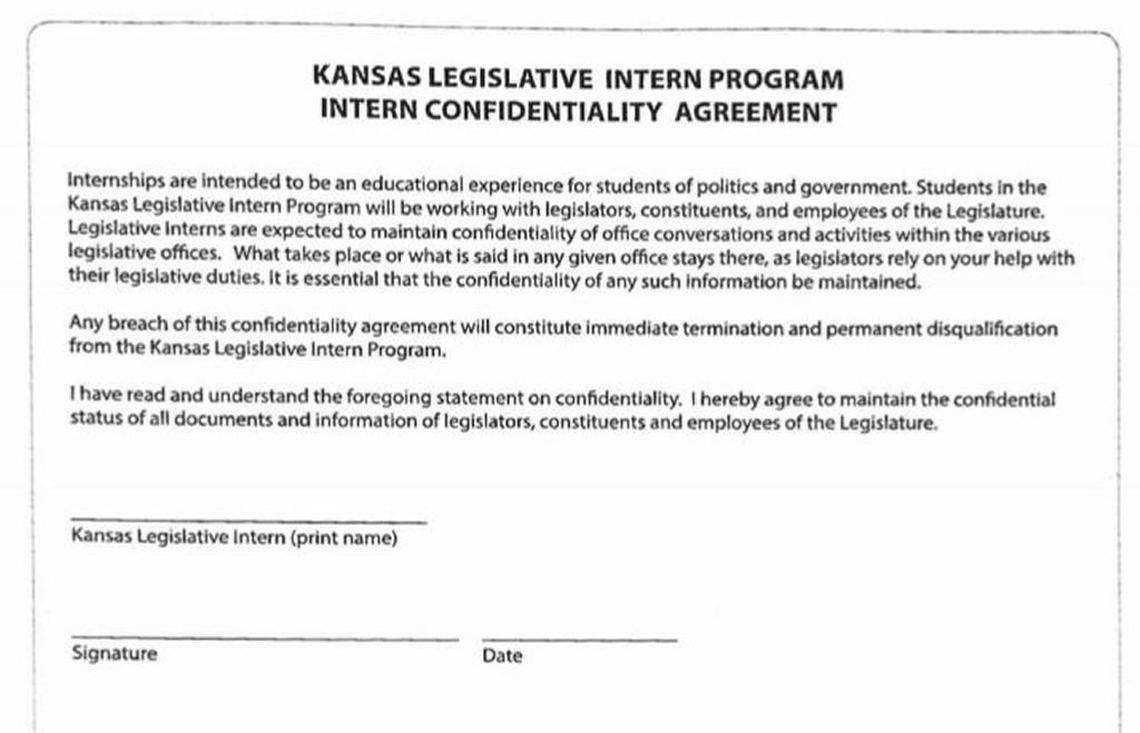 “Any breach of this confidentiality agreement will constitute immediate termination and permanent disqualification from the Kansas Legislative Intern Program.”