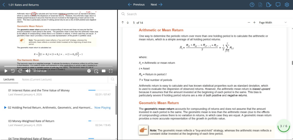 Provides lifetime access to all CFA® Level I content, including full video lectures, reading assignments, formula sheets, review materials, and three mock exams. Includes access to the discussion forum and a pass guarantee. Best for students who want complete flexibility and a polished user experience.