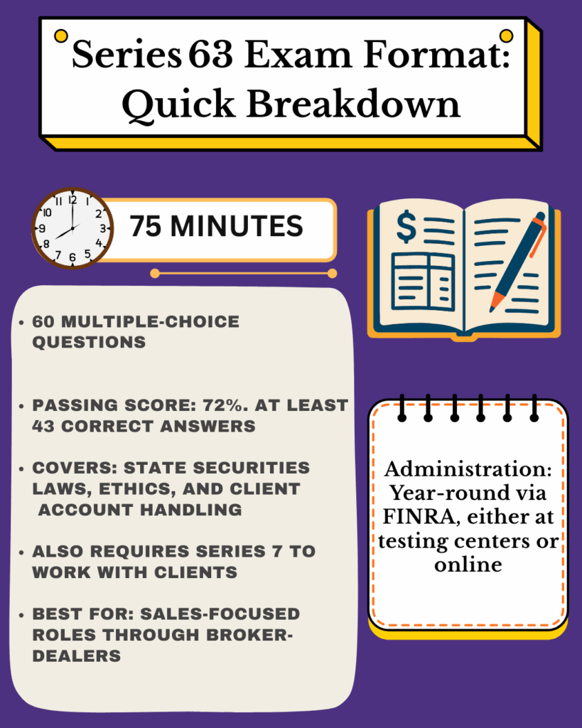 The Series 63 runs 75 minutes and includes 60 scored questions plus five unscored ones. It’s a short test, but careful reading and time management are essential for success.