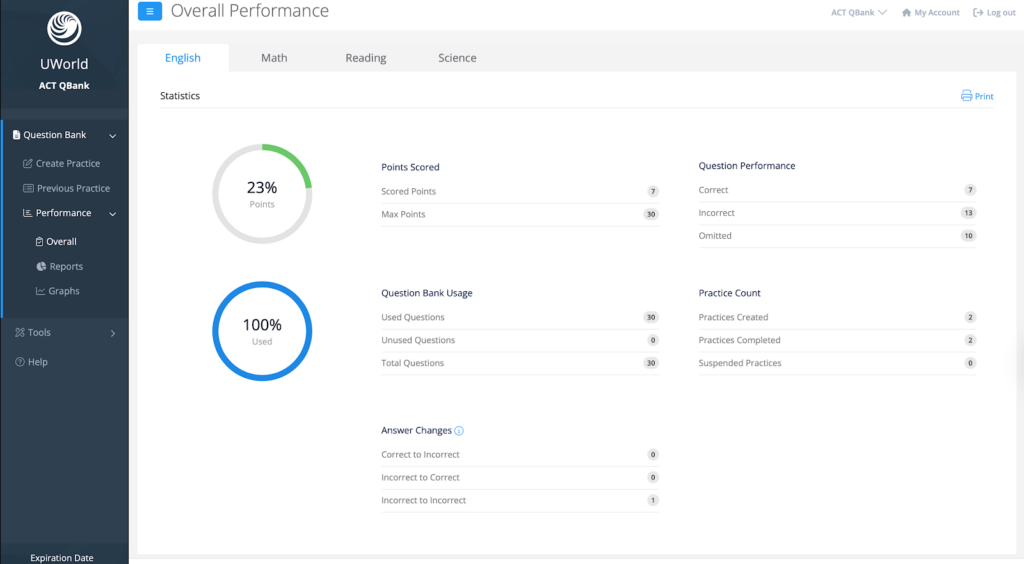 Prep Expert centers on instructor-led video teaching and strategy explanations before heavy practice. UWorld ACT® reverses that flow, letting performance data guide what to review next.