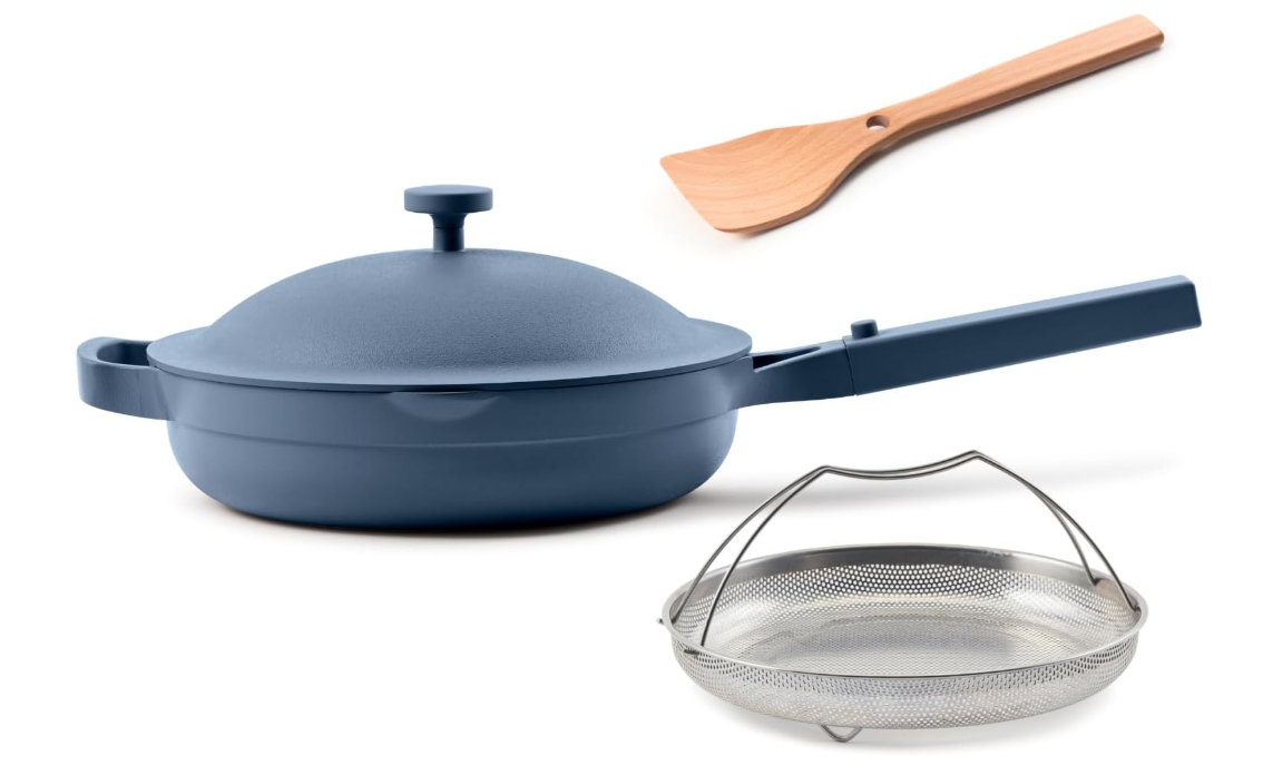 The Always Pan is designed with both functionality and sustainability in mind. Constructed of 100% post-consumer recycled aluminum, this sturdy pan has a ceramic nonstick interior that’s free of PFOAs, PFAS and PTFEs (i.e., the harmful stuff that’s present in Teflon). The pan comes in six earthy, muted colors, including lavender, sage green and “blue salt.” It also comes with a stainless steel steamer insert (which doubles as a colander) and a beechwood spatula that fits right onto the spoon rest on the handle of the pan.