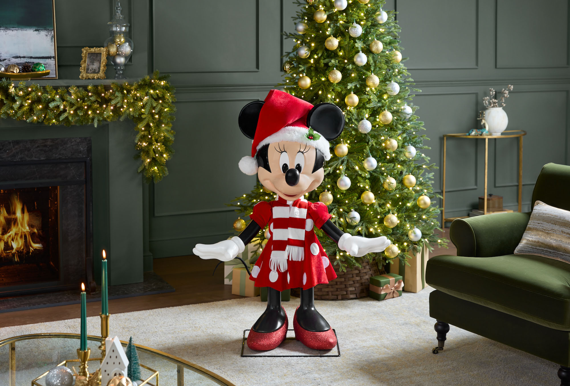 - Merry Minnie Mouse: Dressed in a new velvet outfit, Minnie sings “Jingle Bells” and moves with motion-sensor activation, making her a charming choice for your front porch or entryway—$199