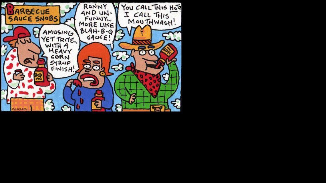 Our favorite Chow Town artist/cartoonist, Charlie Podrebarac, has sketched some classic caricatures of local barbecue snobs. One of my favorites is his “Barbeque Sauce Snobs,” depicting three righteous sauce flamers.