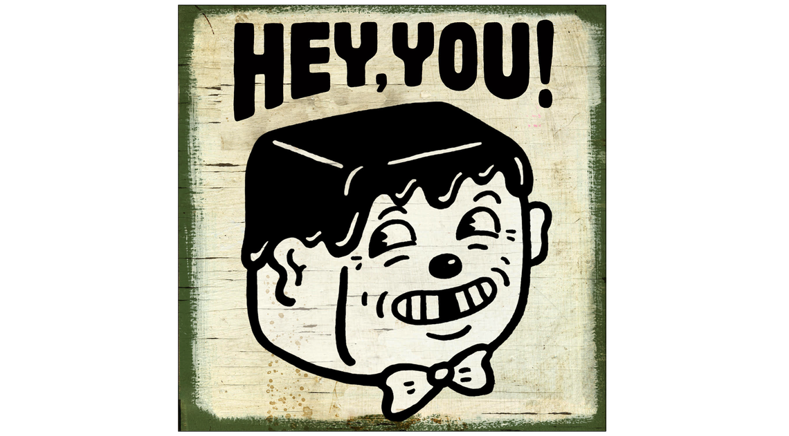While working at Hallmark, he was also creating his own personal pieces during his free time in his ramshackle basement studio and at Hammerspace Community Workshop, surrounded by a sprawling mass of artifacts from his past, present and future. Revisiting his sixth grade Pudgy Mash friend, he began taking characters, graphics, symbols and icons and intertwining them to produce works of fine art. Calling his small business Funhouse 57, he started with prints then moved on to transferring his images tirelessly by hand to wood. His signature pop culture works are infused with 1930s style posters, typography and advertising with original and sophisticated characters and graphics onto the distressed surface. The resulting work possesses a nostalgic feel but also seem completely modern. His style, inspired by vintage comics and advertising art, is re-purposed with the goal of communicating the ironies and comical essence of pop-culture.