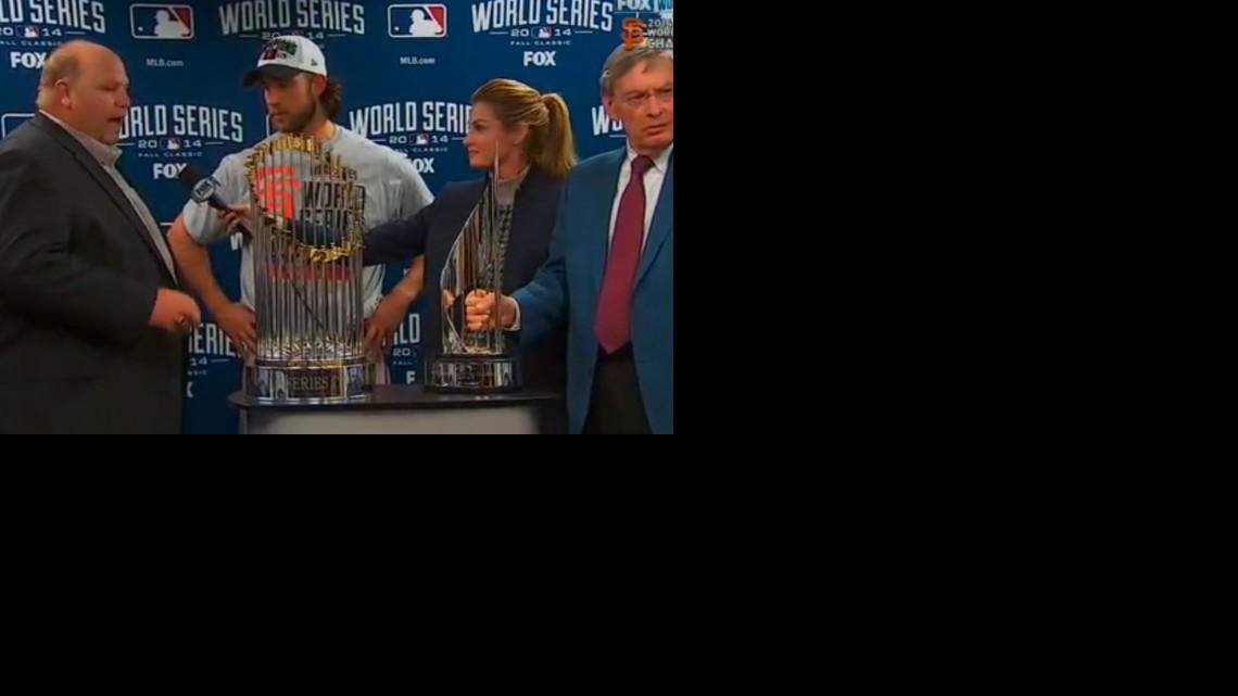 “Madison, congratulations. As the official sponsor or, uh, the official vehicle of Major League Baseball, Chevrolet is proud to participate in this, uh, prestigious award. Um. Along with our dealers we are also extremely honored to give back to this sport, uh, by supporting baseball in cities and towns across this nation. At Chevrolet we have, um (pause for breath), we have also been proud of the latest and greatest, uh, technology in our truck lineup which is the all-new 2015, uh, Chevy Colorado. Um. It combines class-winning and leading, um, you know, technology and stuff with, uh, Wi-Fi powered by OnStar. It’s sitting there on the screen. To recognize your performance in this 2014 World Series, I proudly present to you your very own set of keys to a brand new 2015, uh, Chevy Colorado.”