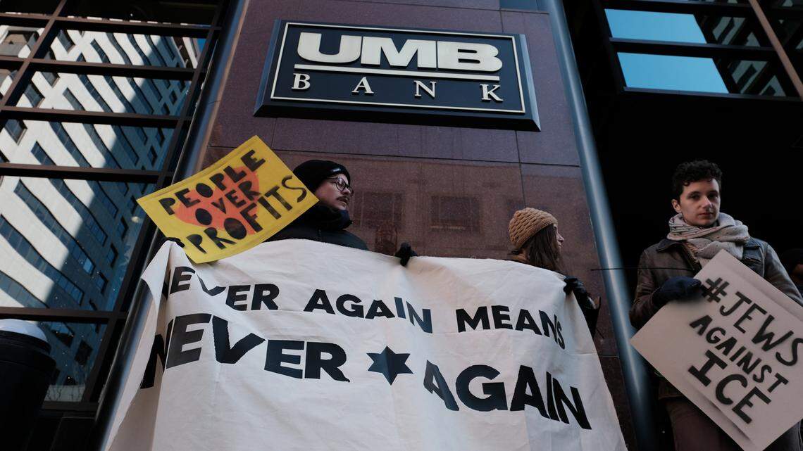 Protesters gathered outside a UMB Bank building in downtown Kansas City Tuesday to demonstrate against the bank’s involvement in immigration detention.