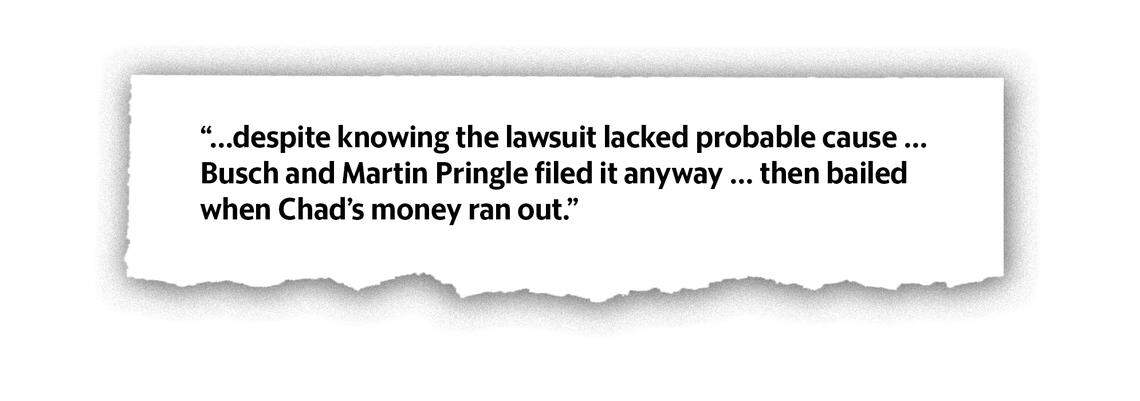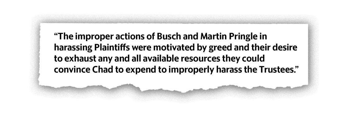 In the malicious prosecution case (filed in December 2017), Monafo for the trustees argues in court papers “despite knowing the lawsuit lacked probable cause … Busch and Martin Pringle filed it anyway … then bailed when Chad’s money ran out.” Chad paid his attorneys more than $125,000, money that had come his way through a previous trust.