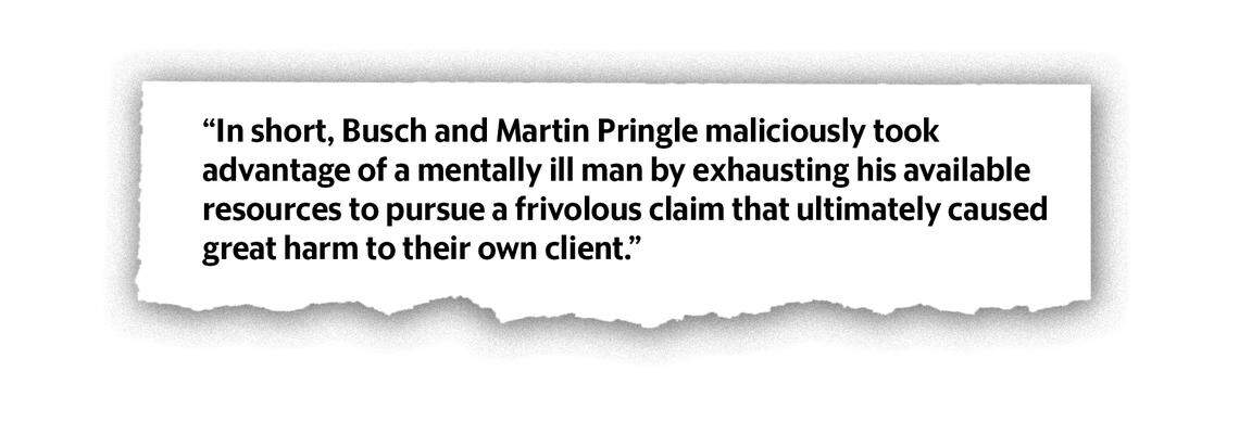 “In short, Busch and Martin Pringle maliciously took advantage of a mentally ill man by exhausting his available resources to pursue a frivolous claim that ultimately caused great harm to their own client,” reads the trustees’ suit, which, while asking for no specific damages, requested $3 million to cover their legal fees.