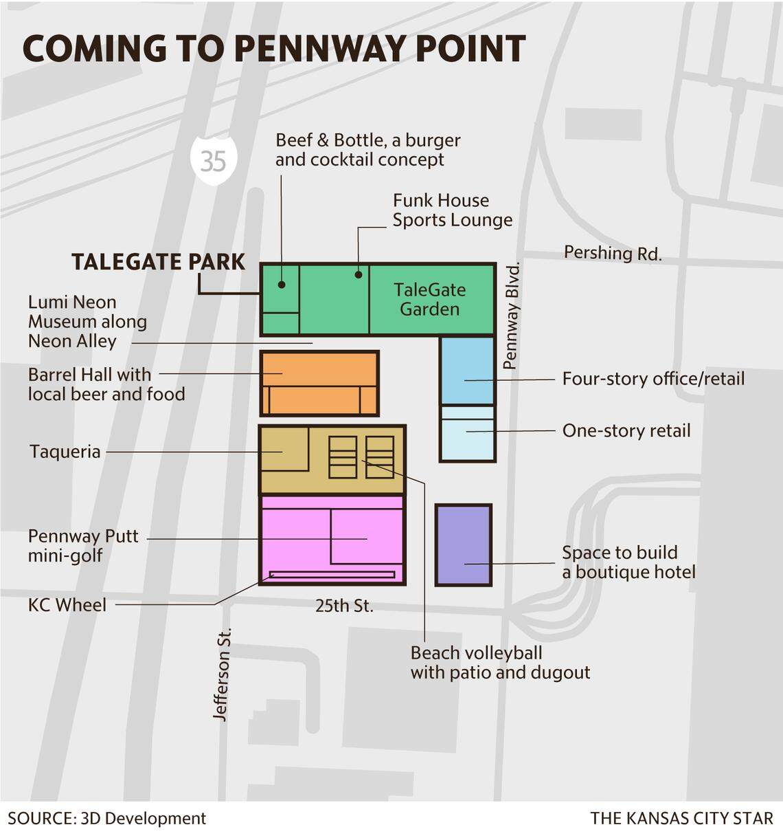 The vision for Pennway Point is to create a broad entertainment district to include restaurant, bars, music, yard games, beach volleyball and winter skating. The old Funkhouser Machinery Co. building is planned to be a 30,000-square-foot indoor/outdoor venue called Talegate Park with a Beef & Bottle restaurant, bars, two kitchen kiosks, an indoor/outdoor beer garden and a mezzanine Funk House club with VIP seating.