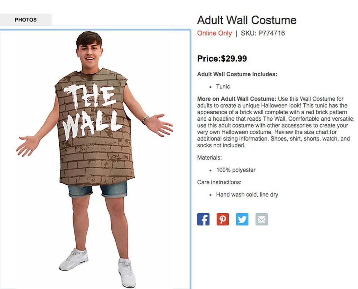 Another costume, this one for adults, has angered more than a few people this Halloween season, too. “The Wall” costume sold by Party City, is printed with brown brick walls and the words “The Wall,” in white, are emblazoned on the front.