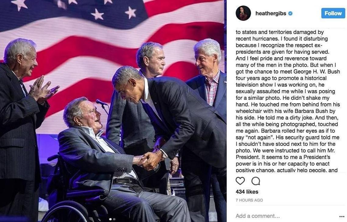 George H.W. Bush apologized for the incident, according to Fox News. Actress Heather Lind, in a now deleted Instagram post, wrote that the 41st president “touched me from behind from his wheelchair with his wife Barbara Bush by his side. He told me a dirty joke. And then, all the while being photographed, touched me again.”