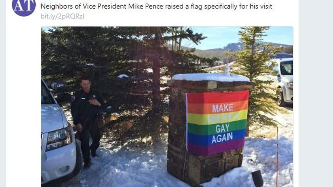 A rainbow flag that says, “MAKE AMERICA GAY AGAIN,” was hung at a home near Vice President Mike Pence’s Colorado vacation home.