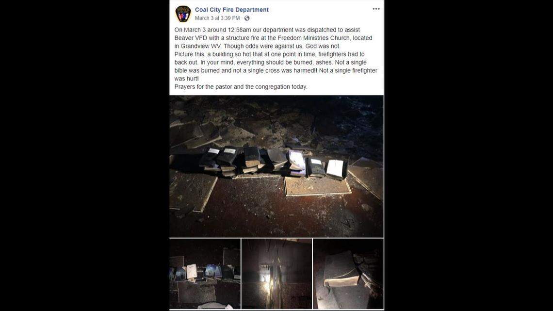 Crews found out the flames in Freedom Ministries church in Raleigh County didn’t damage the church’s crosses or Bibles, the Coal City Fire Department said on Facebook.