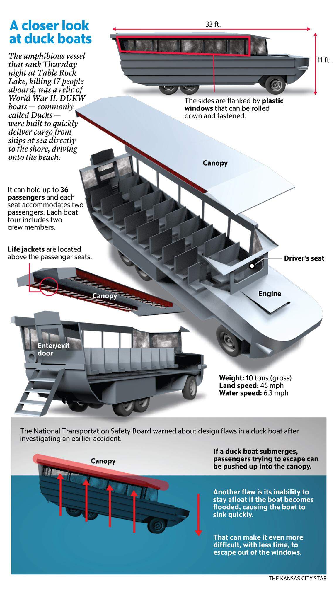 The presence of an overhead canopy and side curtains were said to have restricted passengers from escaping as the duck boat took on water and started to sink.