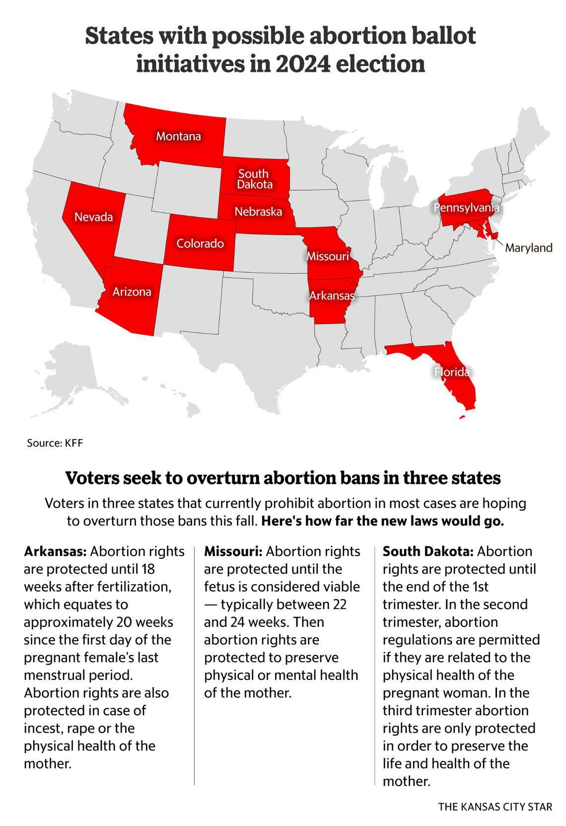 Missouri’s measure goes the furthest to increase access, seeking protections through fetal viability, a standard established by the Supreme Court in Roe v. Wade. Advocates in two other states seeking to overturn bans this year took a more limited approach.
