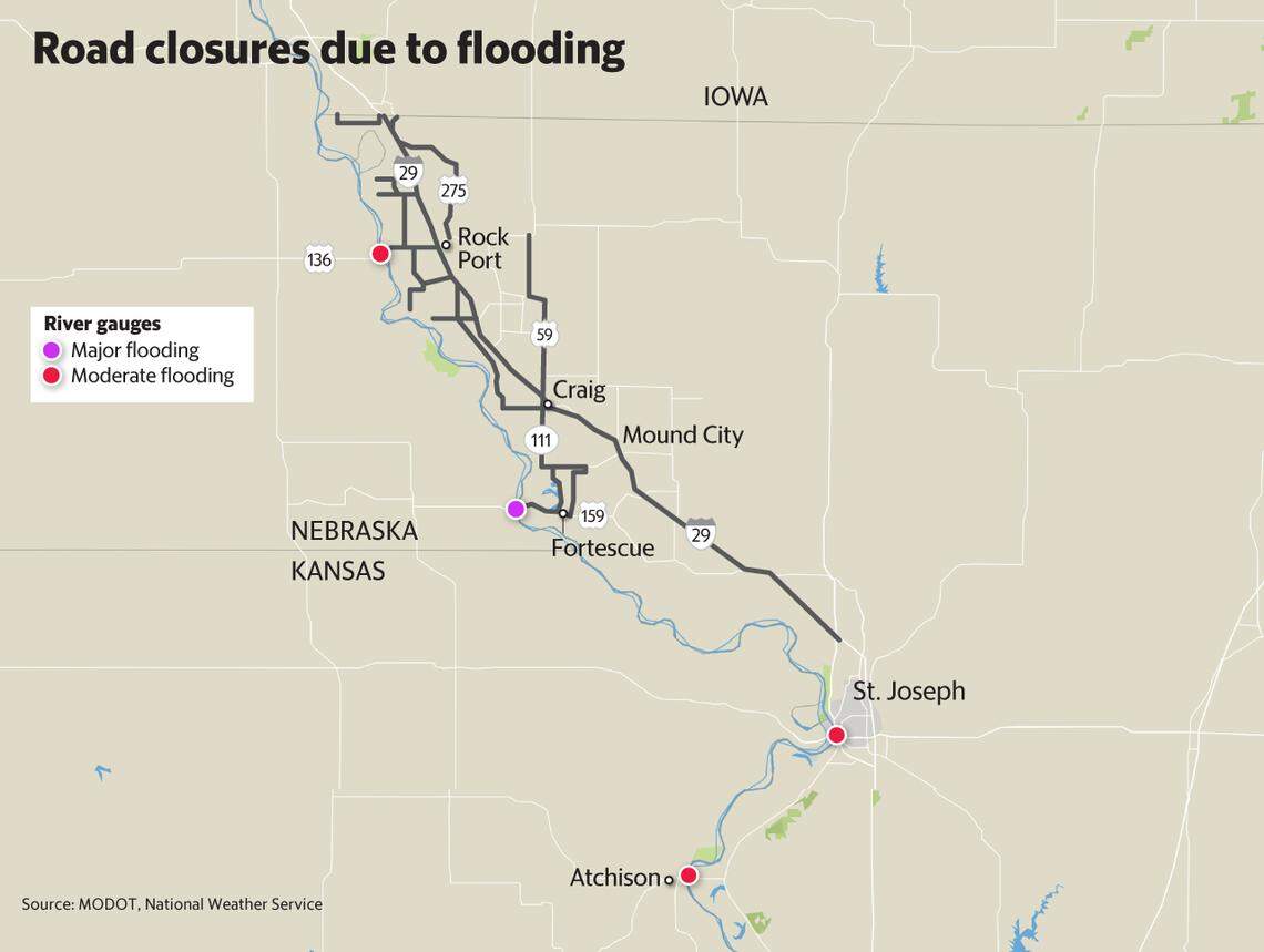 The Missouri Department of Transportation has closed Interstate 29 north of St. Joseph. Kansas City Power and Light said Wednesday that electricity has been cut off for “customers in Northwest Missouri, including areas of St. Joseph as water topped levies near those communities.”