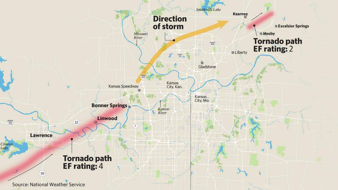 One touched down on the Kansas side, in the southwest corner of Douglas County, and spun its way up past Lawrence and Linwood toward Bonner Springs in the Kansas City metropolitan area.