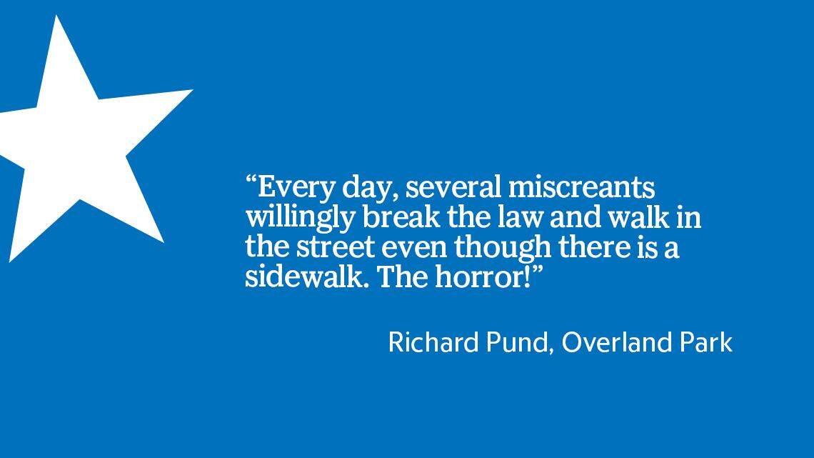 I never knew it until now, but my neighborhood is a hub of criminal activity. Every day, several miscreants willingly break the law and walk in the street even though there is a sidewalk. The horror! (July 31, 11A, “Why this Black Lives Matter protest went bad”)