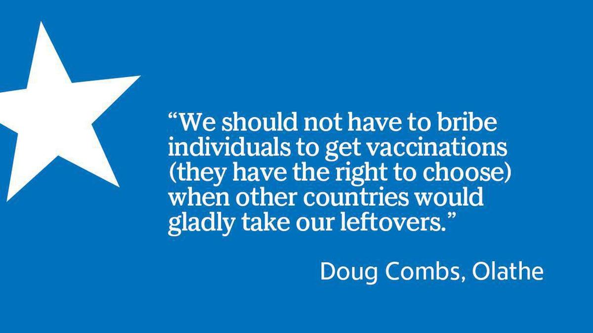A Wednesday letter writer (10A) suggested setting a deadline for Americans to get vaccinated for free, after which the vaccines should be sent to other countries in need. I agree with setting a deadline. That would be motivation for those sitting on the fence and would increase the lines for free COVID-19 vaccinations.