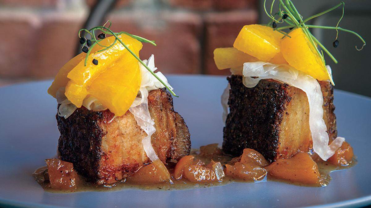 Imagine the scene from “Crocodile Dundee” where Paul Hogan whips out a large blade to compare to a street thug’s switchblade. Now replace that switchblade with Gulf Coast shrimp and Dundee’s knife with Australian prawns. These are closer to langostino in size and flavor, served with the heads on and gentle advice that sucking on them is completely acceptable. Served on a bed of polenta and flavored with sage and bacon, the prawns are Rob’s ode to Southern shrimp and grits.