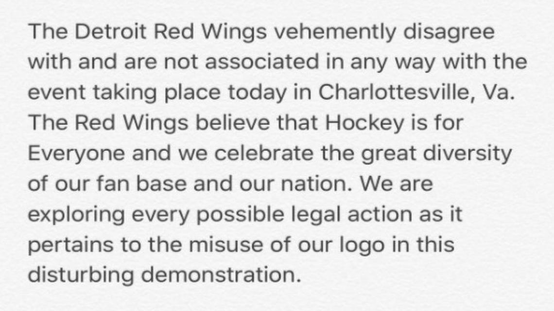 In response, the NHL's Detroit Red Wings issued a statement Saturday condemning the bastardized use of their logo in such a hateful way and threatened legal action.