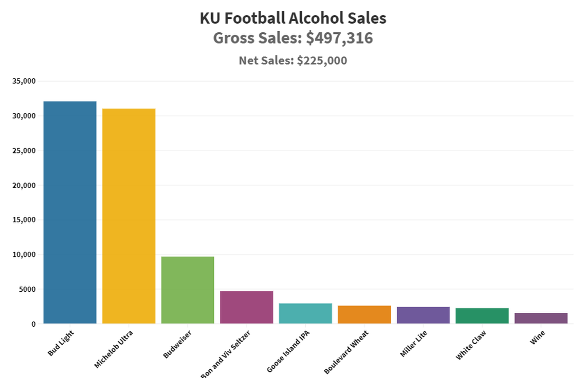 Kansas also cashed in after introducing alcohol at its football games, selling $497,316 worth of beer and wine at Memorial Stadium for a net profit of approximately $225,000, Long said. The Jayhawks averaged an announced attendance of 33,874 at their seven home games, but it appears many of those fans purchased drinks while they watched first-year coach Les Miles and his team.