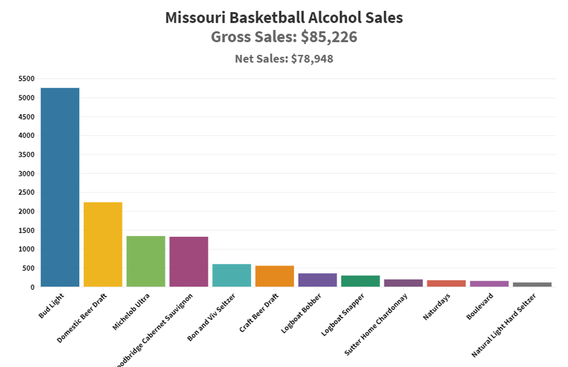 At Missouri, fans were much more receptive of wine. Woodbridge Cabernet Sauvignon was the fourth-most popular drink sold among the 12 offered at basketball games, behind Bud Light, draft domestic beer and Michelob Ultra. Craft beer wasn’t much of a hit in Columbia, with Boulevard ranking last at just 152 units sold. But the Kansas City favorite did beat out Natural Light Hard Seltzer, which ranked last.