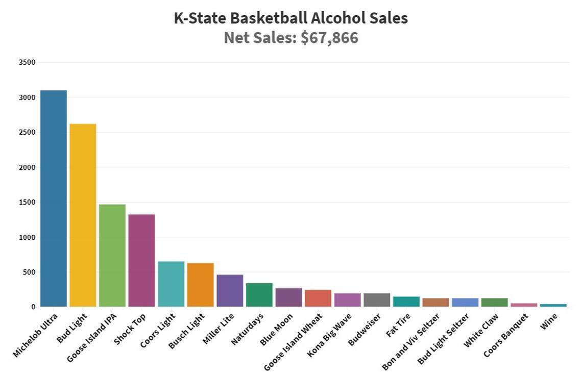 At K-State, fans embraced variety and purchased 18 different kinds of alcoholic beverages. Among those, they gave Coors Banquet a particularly cold shoulder. The school sold just 48 cans of that beer all season. But the Wildcats liked Goose Island IPA (1,464), Shock Top (1,320), Coors Light (648) and Naturdays (336) in addition to Bud Light (2,616) and Michelob Ultra (3,096). Similar to KU, wine ranked last.