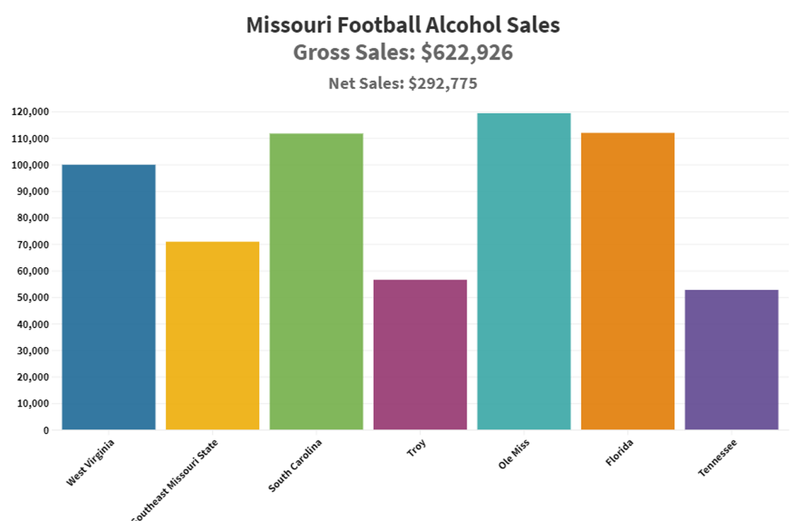 For example: Missouri totaled $119,926 in alcohol sales when 62,021 fans watched the Tigers play Mississippi. That was their highest number of the season, but MU also reached six figures in alcohol sales during home games against South Carolina and Florida.