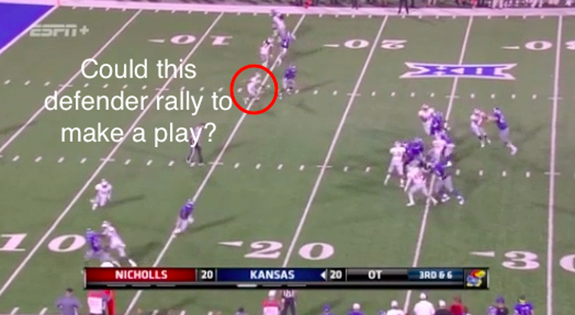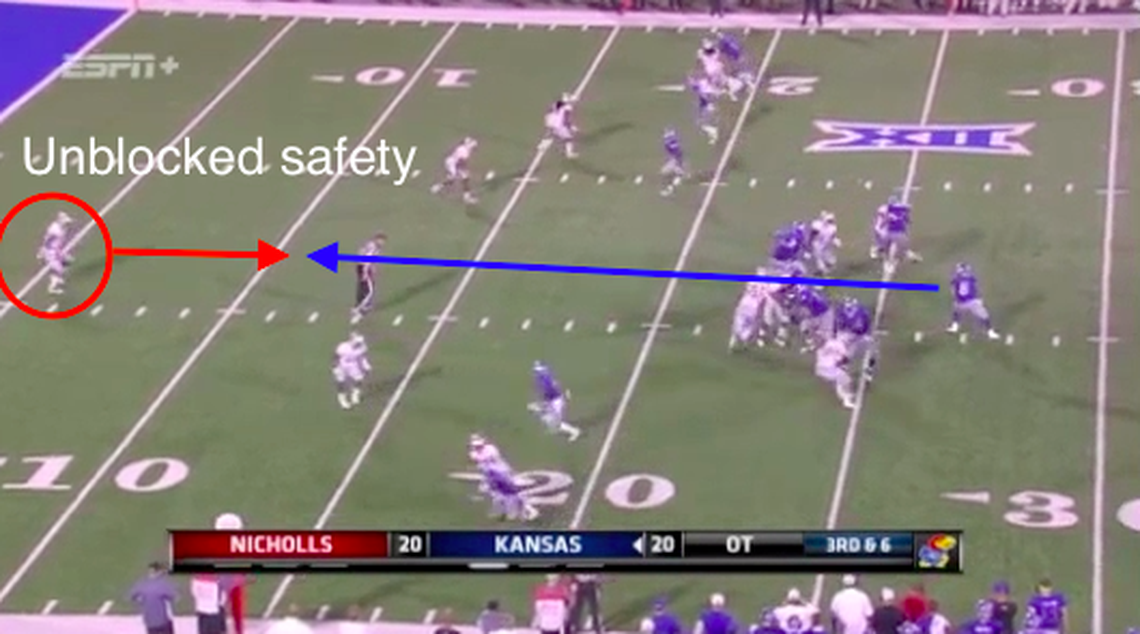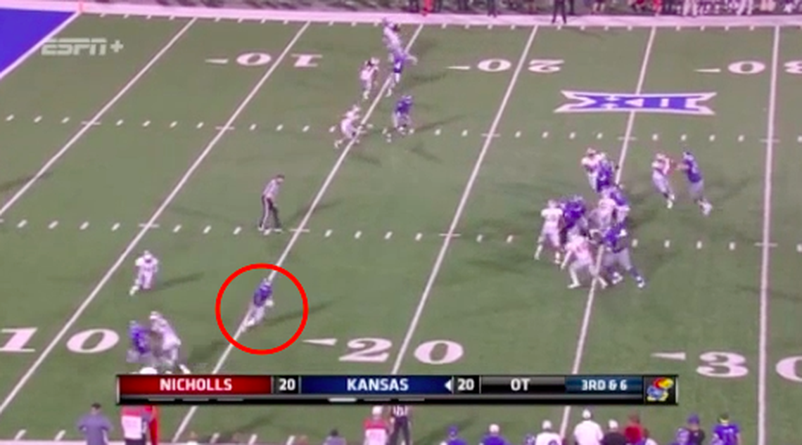 From Kendrick’s actions, it appears the “pass” part of this run-pass play was not an option. He was likely told by KU’s coaches — who had seen Nicholls State’s defensive tendencies — to run no matter what.