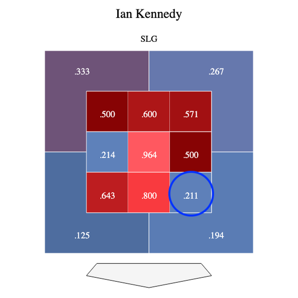 The blue circle indicates that low-and-away zone to righties, who weren’t able to generate much force when Kennedy was able to hit that spot.