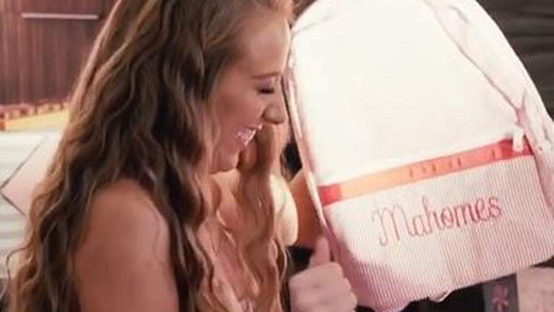 Travis Kelce’s girlfriend, Kayla Nicole, was at the shower, and Mahomes recorded a video that was played.
