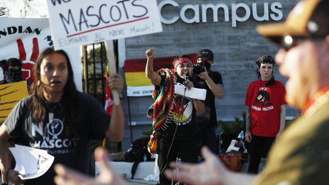”We’re just saying if you’re not going to honor us, don’t use the arrowhead,” yelled one protester. “You’re mocking our people!”