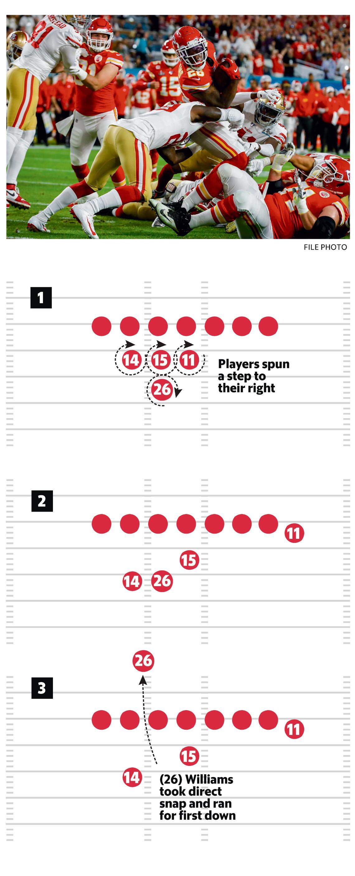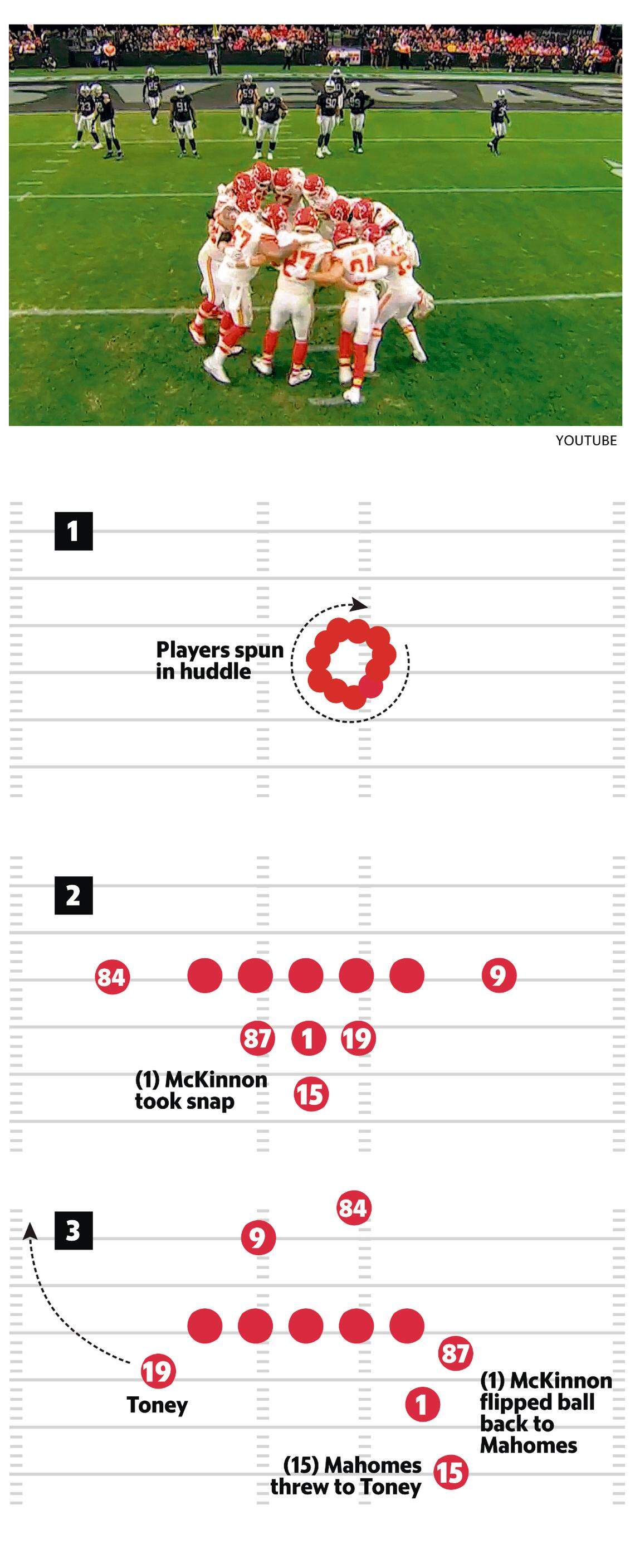 This play stands out for two distinct reasons. First: The “Ring Around The Rosie” spinning huddle was simply a joy to watch. Second: When the Chiefs lined up, they were in a hybrid option/pistol formation. Running back Jerick McKinnon was the quarterback in the shotgun, quarterback Patrick Mahomes was behind him, tight end Travis Kelce was lined up in the backfield on the left side and wide receiver Kadarius Toney was in the H-back spot on the right. McKinnon took the snap and flipped the ball to Mahomes, who threw to Toney, who had run to the left. This was mad scientist stuff.