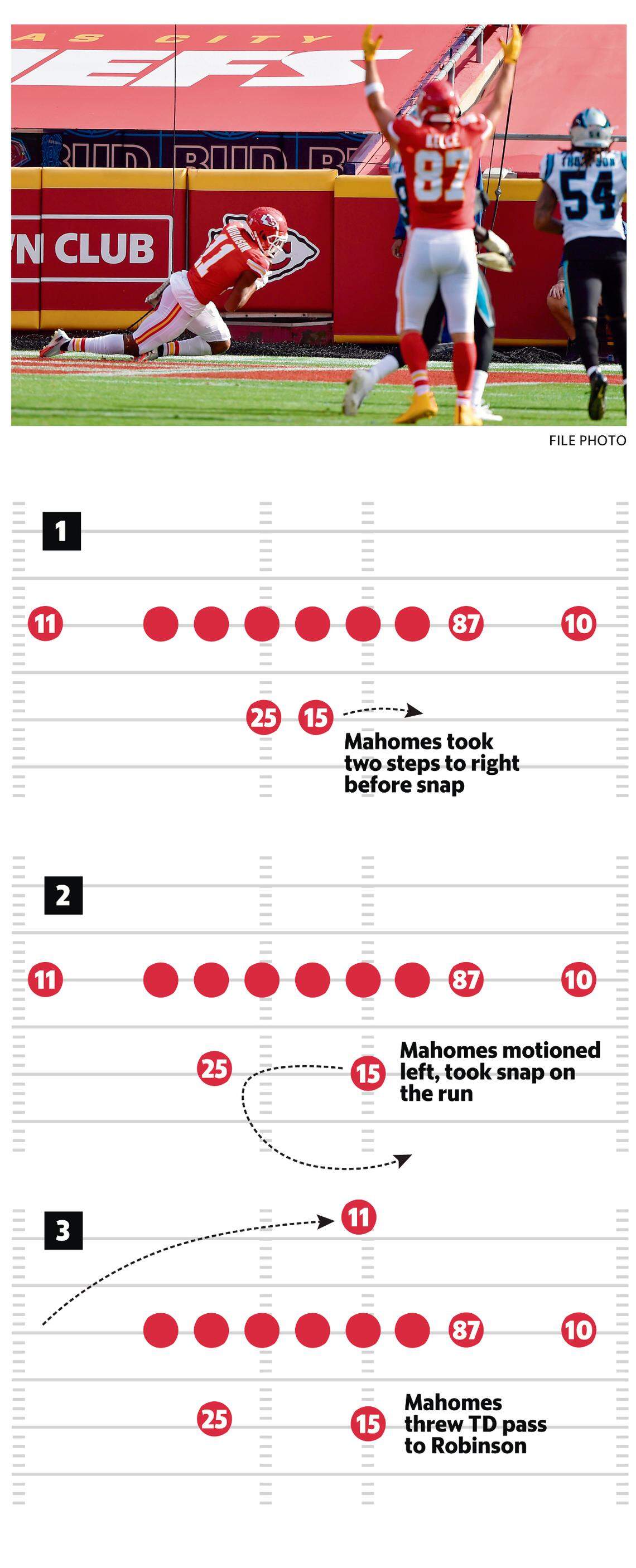 The Chiefs sprang something new on the NFL and, well, the sport of football during a game against the Panthers in 2020. It’s not unusual to see players go in motion before the ball is snapped. But the quarterback? That had never been done before until Mahomes took a few steps to his right, barked out instructions and then went in motion to the left. He took the snap on the run. Mahomes circled back around to the right and zipped a pass to Robinson, who was lined up wide on the left and ran back across the end zone to make the catch.