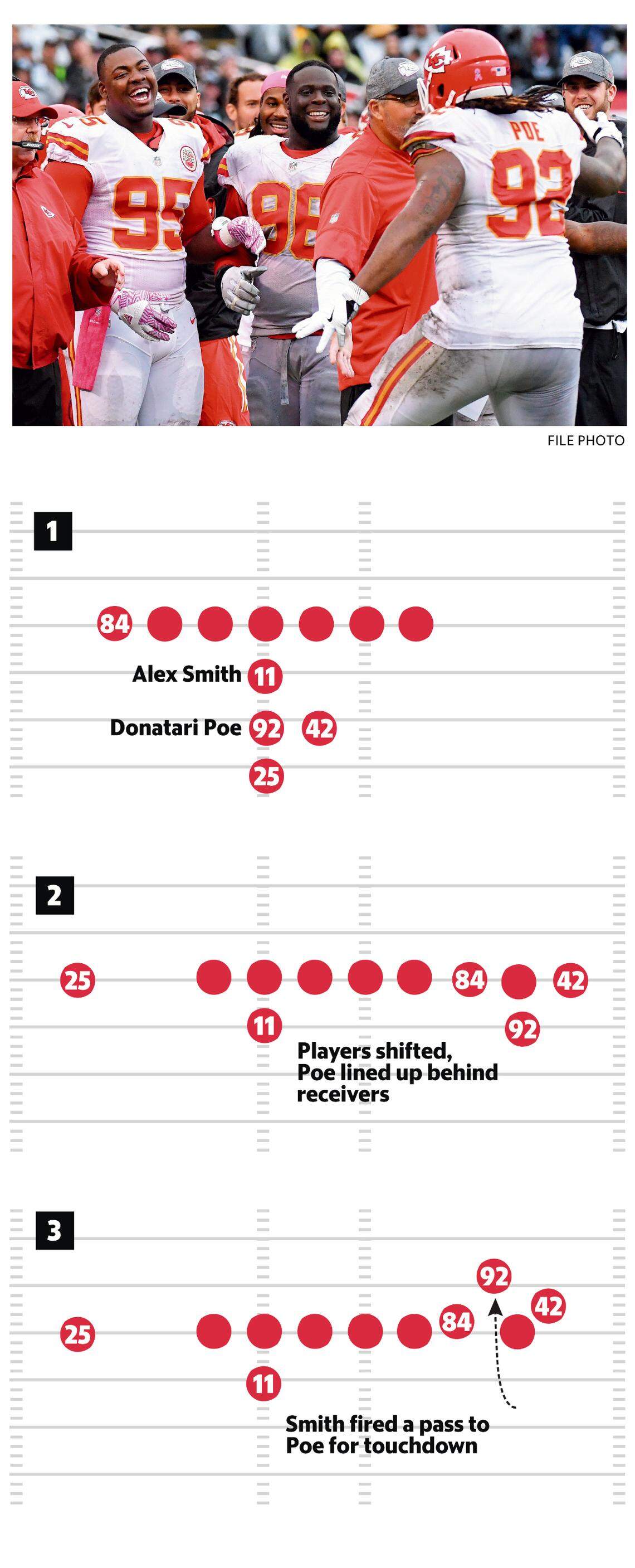 During a 2016 game against the Raiders in Oakland, the Chiefs’ offense included nose tackle Dontari Poe for one play. It’s not unusual to see a big guy in the backfield. But this time the Chiefs motioned Poe from the backfield out wide on the right side, a couple of yards behind a trio of receivers. The Chiefs were on the Raiders’ 1-yard line, so this could’ve been an attempt at deception, but no, Poe was the intended receiver on the play. Quarterback Alex Smith took the snap, turned and fired the ball to Poe. He caught it and followed his blockers into the end zone. Of Andy Reid’s many trick plays, this one might boast the best name.