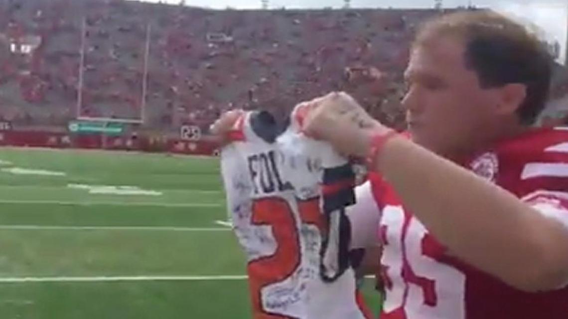 The Cornhuskers keep a Sam Foltz jersey on their sideline. He was the team’s punter who died in a car accident in July. Some of the Illini players presented Nebraska team members an Illinois jersey with Foltz’s name and number on it.
