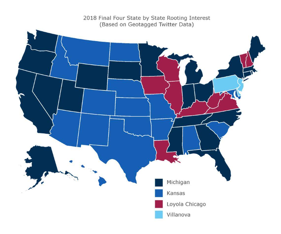 Ahead of the Final Four, Sportsbetting.ag analyzed "geotagged Twitter data" and fan hashtags from more than 250,000 tweets in all 50 states and determined which of Final Four team was the most popular. Michigan "won" 22 states, followed by Kansas with 16 and Loyola Chicago at nine. Villanova, which faced KU on Saturday, was tops in three states.