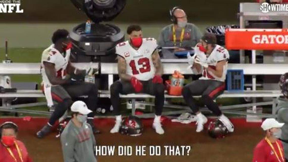 An NFL Films video of Buccaneers players who were wired for sound shows Buccaneers wide receiver Chris Godwin marveling at some of Mahomes’ throws.
