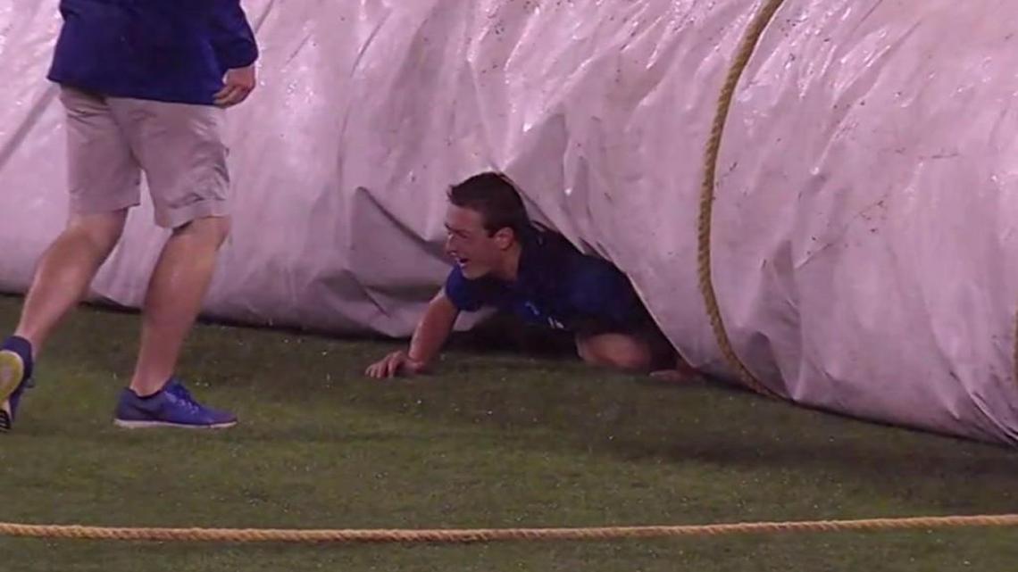 Free entry to a baseball game, including Thursday night’s American League Division Series opener between the Royals and Astros. However, one member of the Royals crew had an unfortunate accident while unrolling the tarp at Kauffman Stadium:
