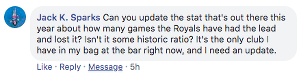 Some context. More than one out of every three times the Royals play, they not only lose but blow a lead in the process. It’s the most in baseball (though the Orioles will have something to say about that) and more than they had the entire season in 2015.