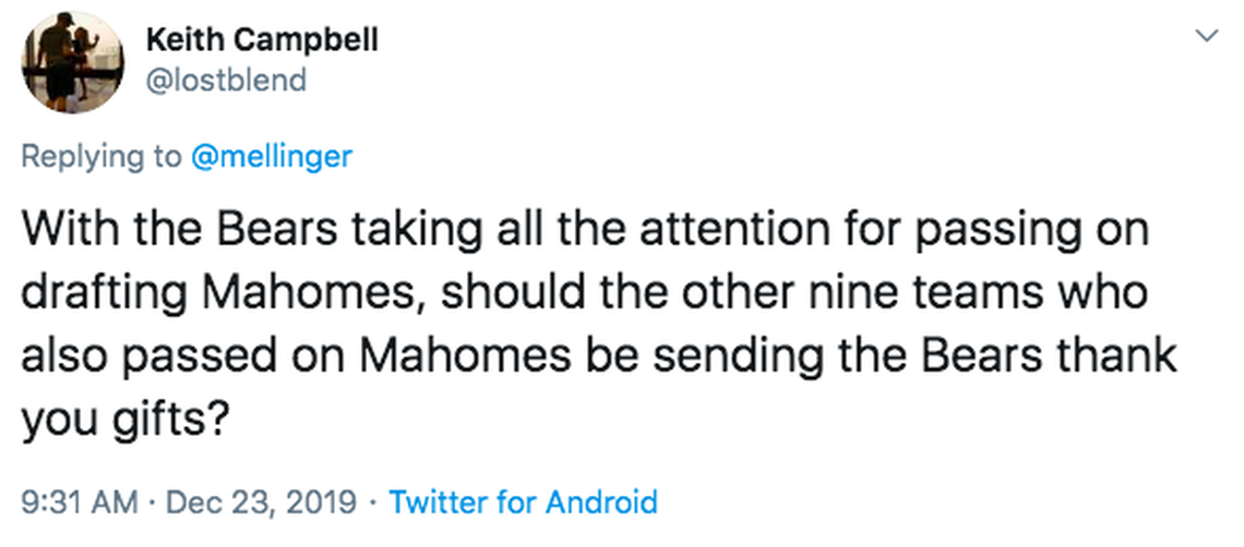 Interestingly, the Chargers were among the teams I’d heard were particularly high on Mahomes in the draft. How much different would the AFC West be right now if they’d taken him instead of receiver Mike Williams?