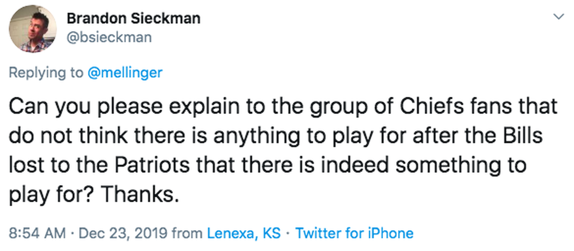 - On the (very) small chance the Patriots lose to the (very) bad Dolphins, a win would give the Chiefs the No. 2 seed and first-round bye.