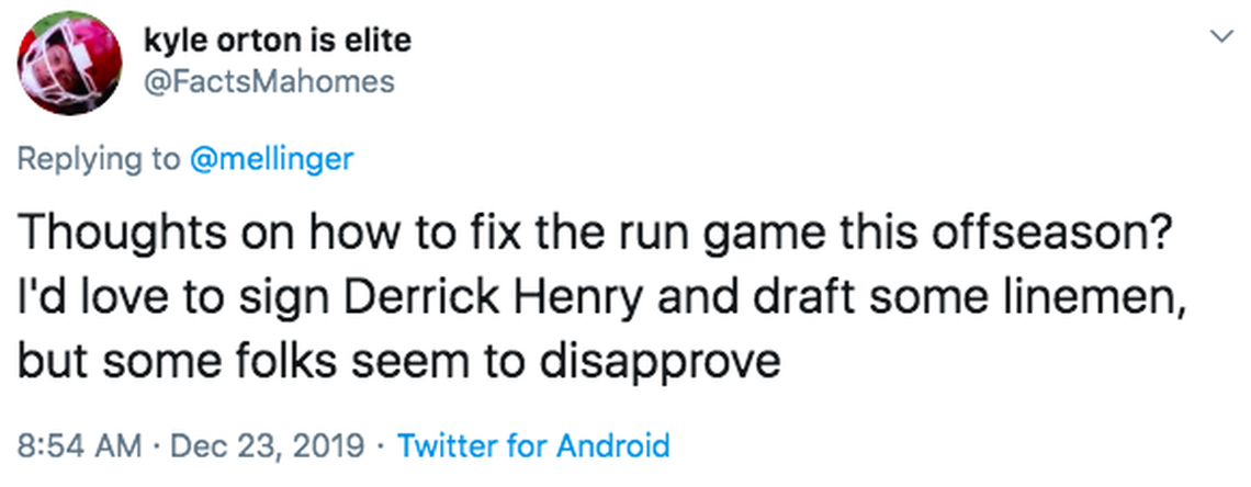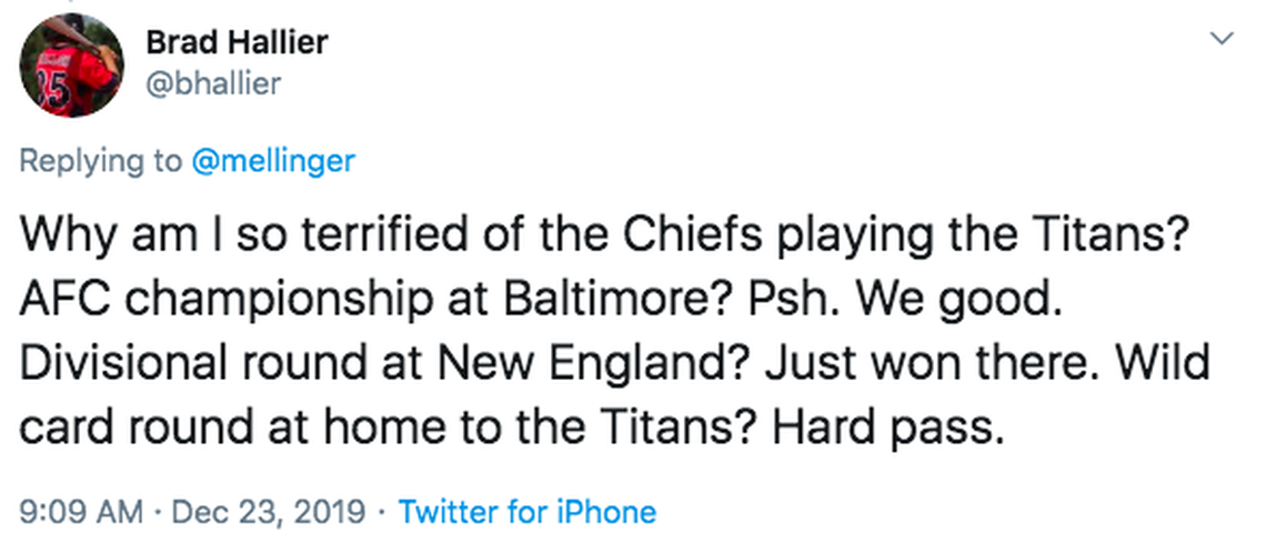 But I do think it would be better for the Chiefs to play the Bills than the Titans.