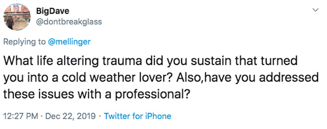 Let’s set some ground rules first. My ideal temperature is in the 60s, not the 20s, but I prefer the 50s to the 80s and the 30s to anything above 90.