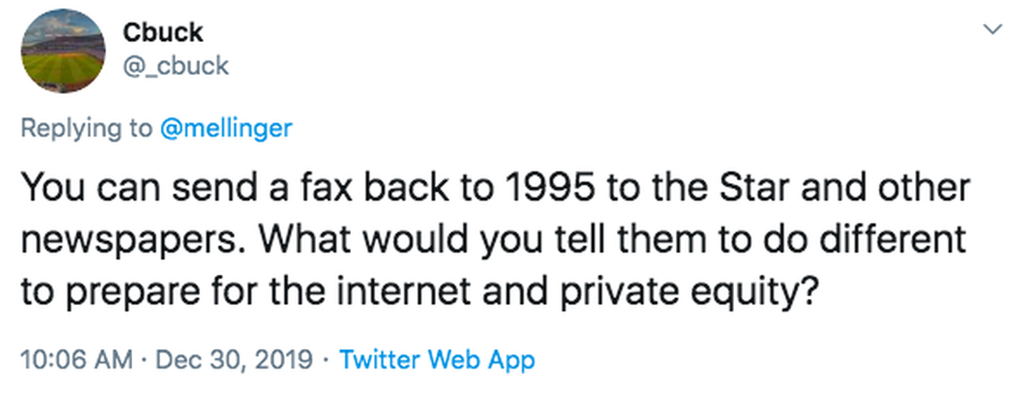 It’s insane that anyone compares what a newspaper is now to what a newspaper was 25 years ago. The only comparison that matters is what a newspaper is now compared to what else is out there, and the story that newspapers need to be telling is the one that focuses on them (still) having (far) more resources dedicated to coverage of local news and sports than anyone else.