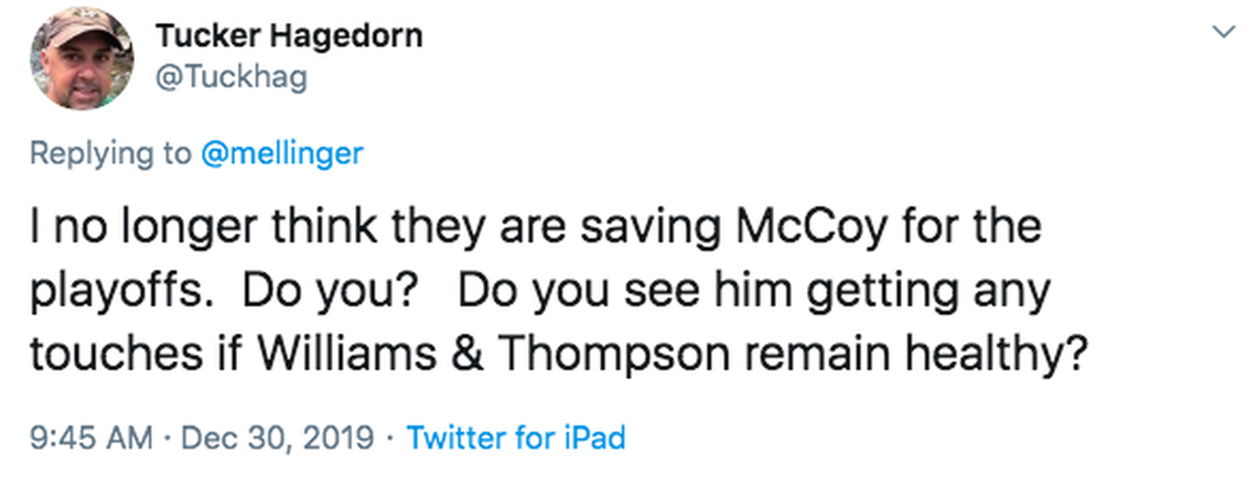 It’s also worth noting that McCoy has missed three games and averaged just 3.5 yards per attempt since the game in Denver.