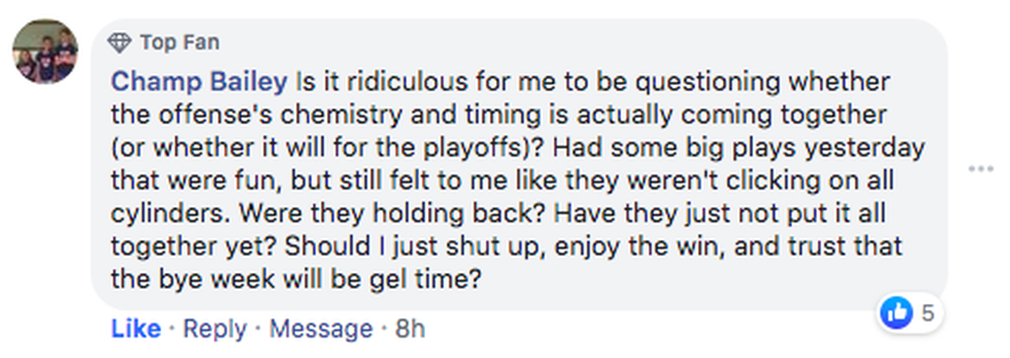 I guess another way of putting it is this: the offense hasn’t been a weekly highlight tape, but it has had enough 2018 moments. And more to the point: that group has made every play that they’ve needed to make since Week 10 and even longer if you blame special teams for messing up the kicks that day in Nashville.