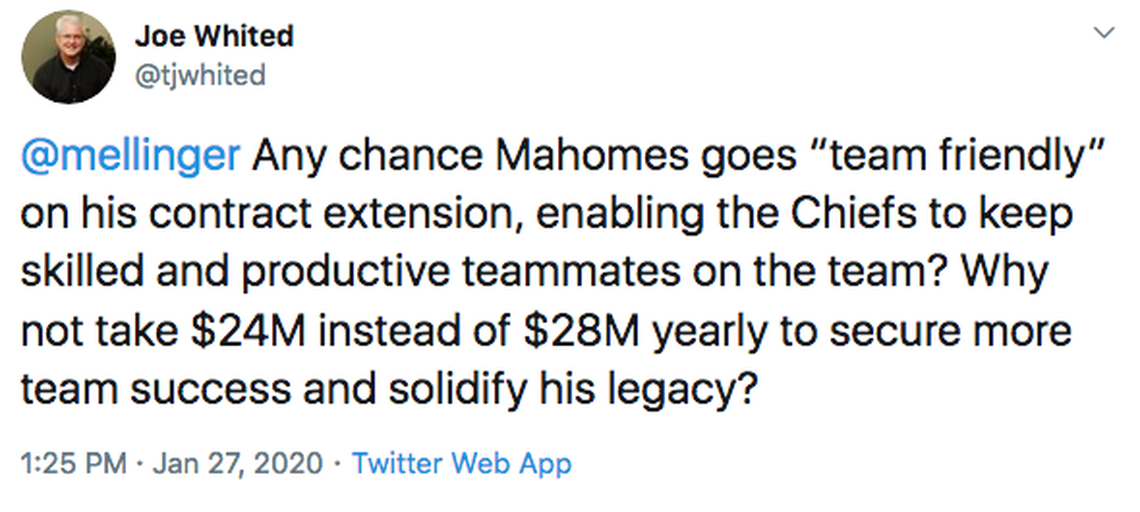 I don’t know Mahomes’ wishes. I don’t know what his agents want. I do think it’s a little unfair to expect a guy to leave significant money on the table for his first contract, though. Whatever he gets he’ll be underpaid.