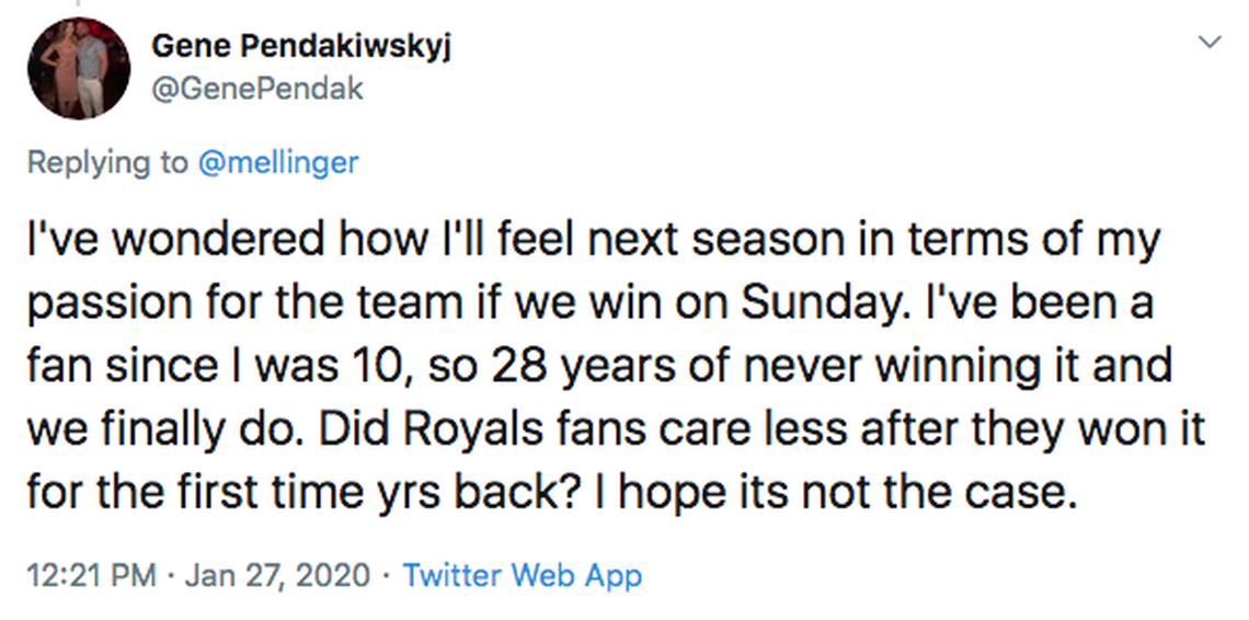 Whatever it’s worth, I’m not sure the parallel can be made with the Royals. Same city, sure, and many of the same fans. But I’m not sure I know anyone who feels like they have the exact same relationship with the Royals as they do with the Chiefs.